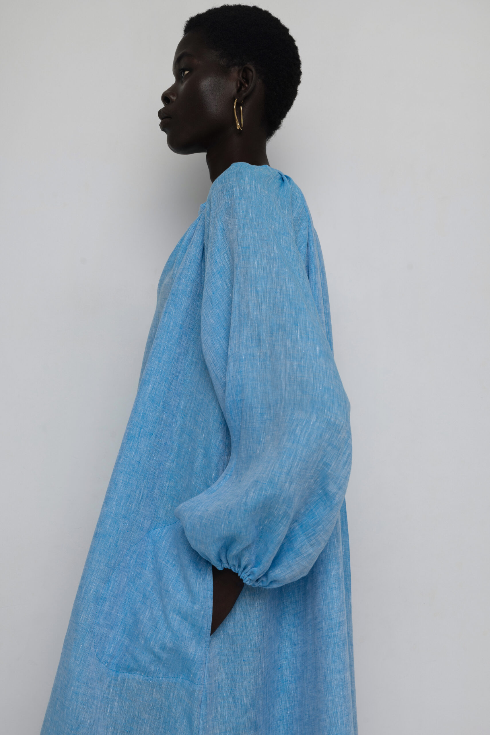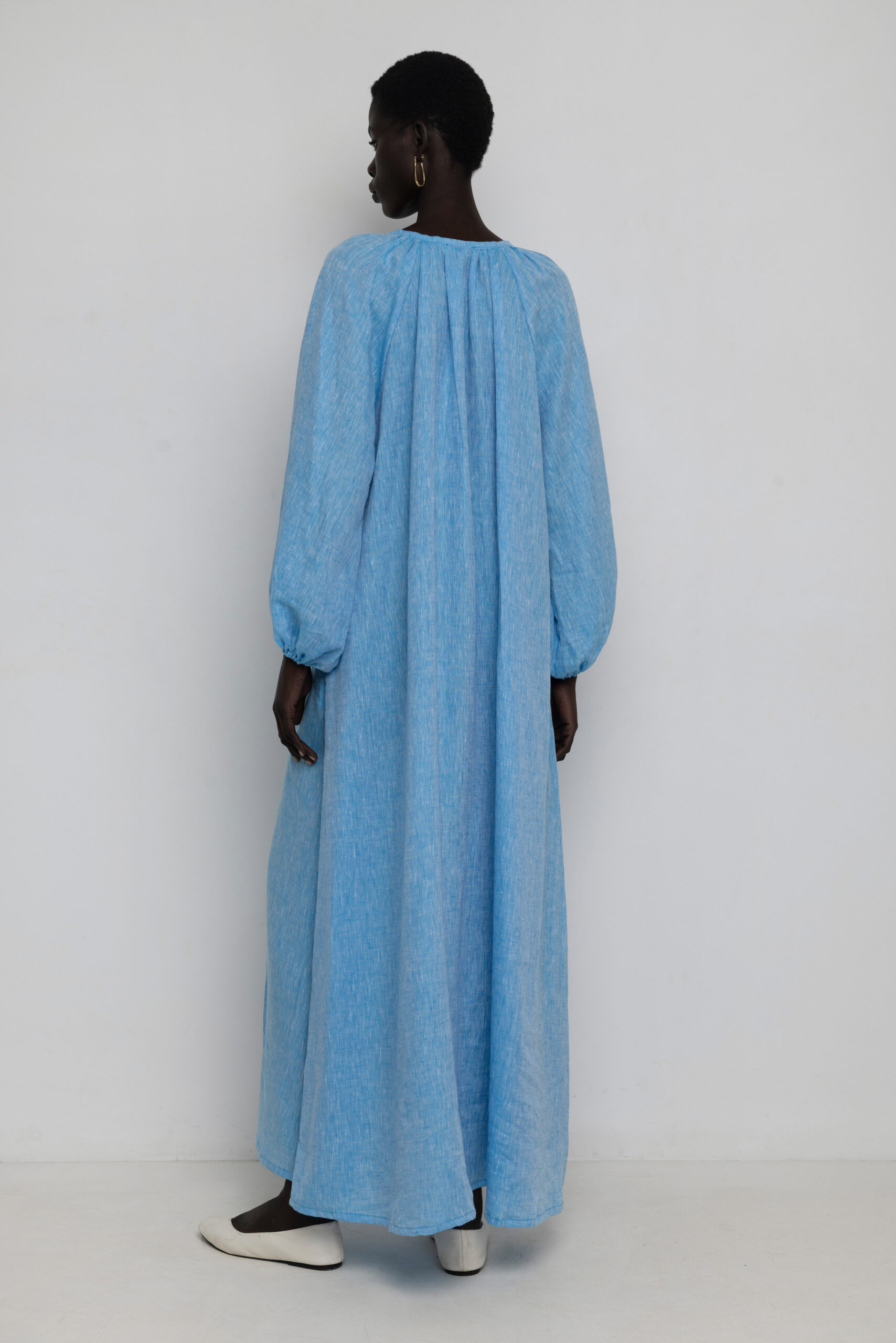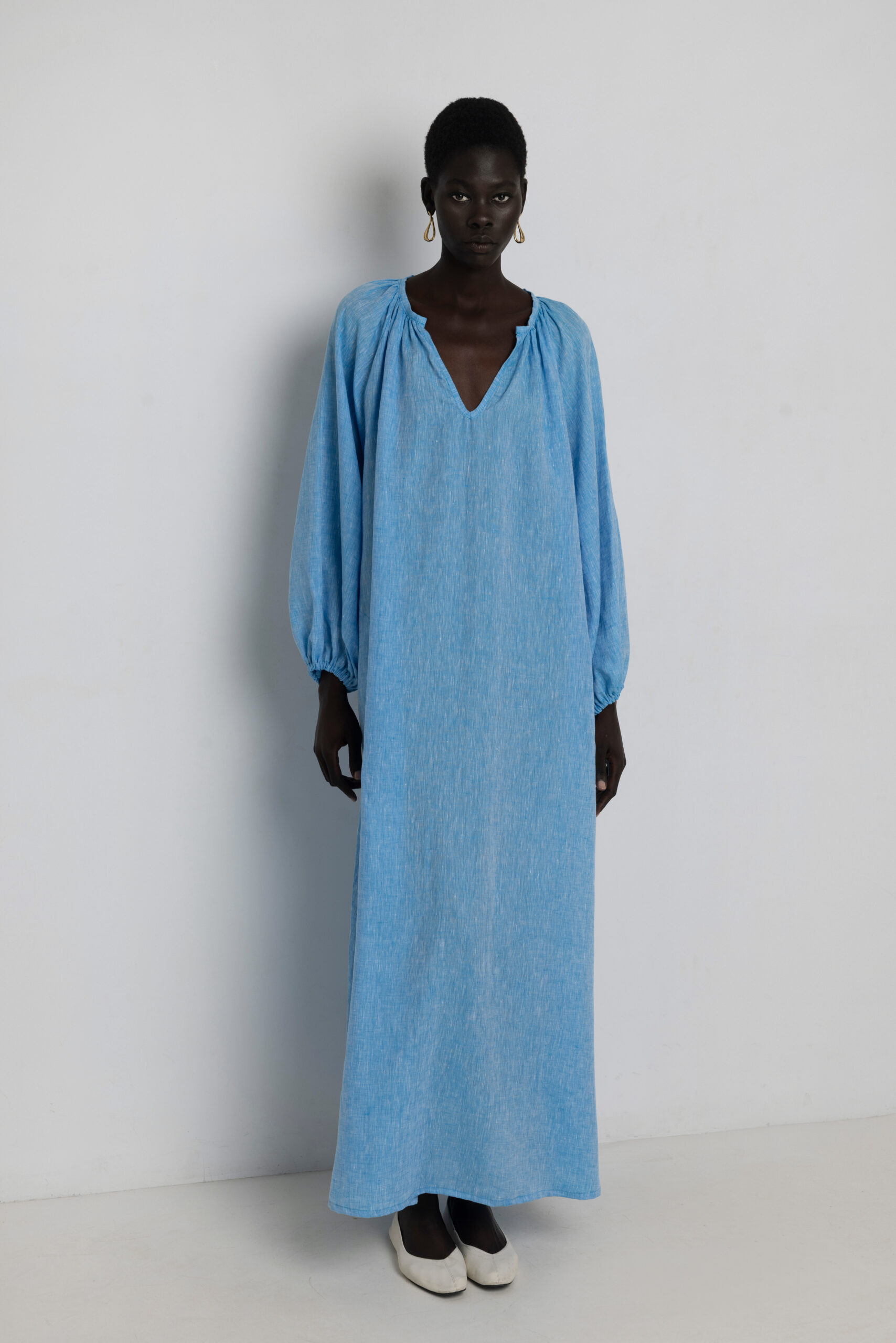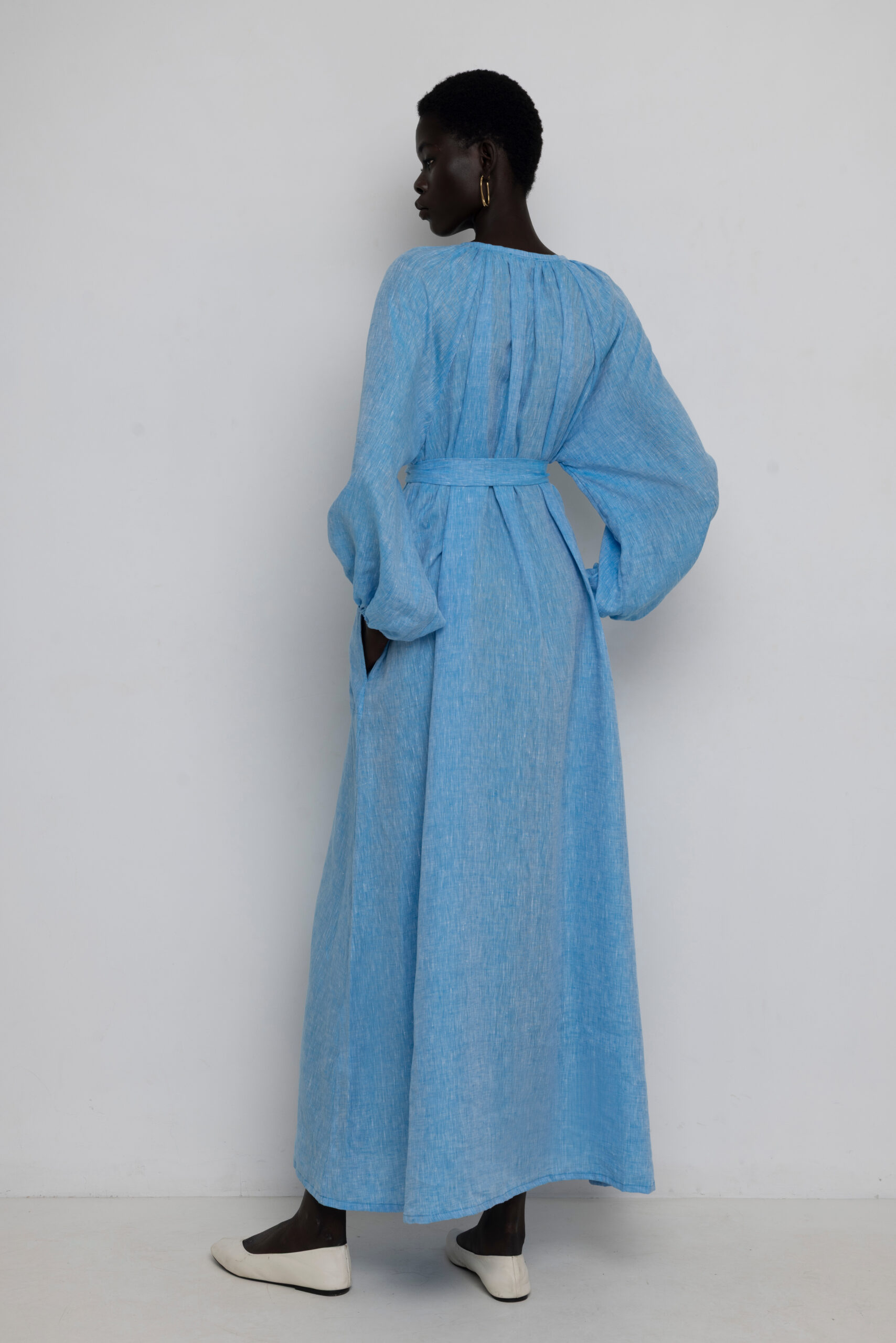 This thoughtfully crafted maxi length dress features a flattering V-neckline and delicate gathered detailing at the shoulders, adding a touch of femininity to its silhouette. Finely finished cuffs elevate its artisanal charm, while a removable self-tie belt allows for adjustable styling. With practical side slit pockets, this piece effortlessly blends elegance with everyday ease.