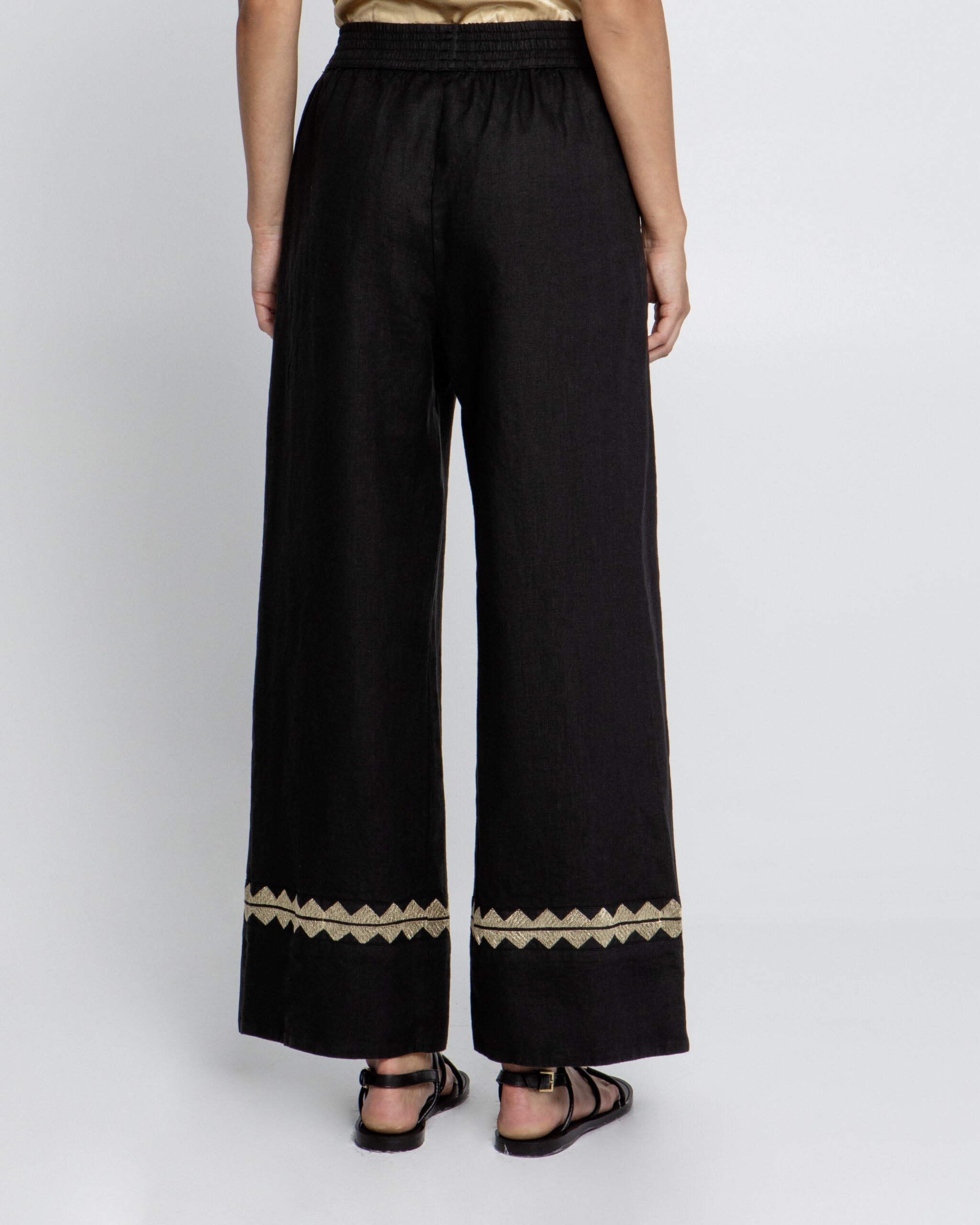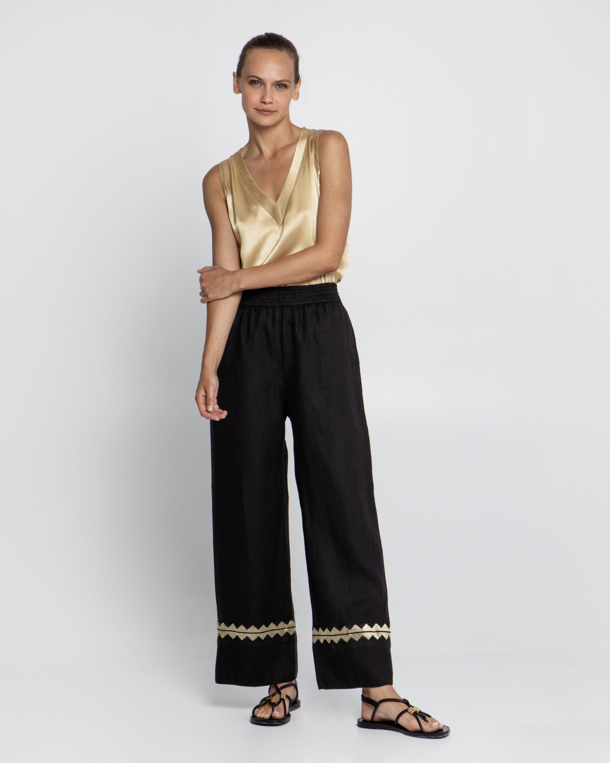 Lightweight black linen pants designed for effortless summer style, featuring a comfortable elasticated waistband and a breezy, relaxed fit. Finished with a subtle gold thread chevron detail near the hem, they add just the right touch of understated elegance for both day and night wear.