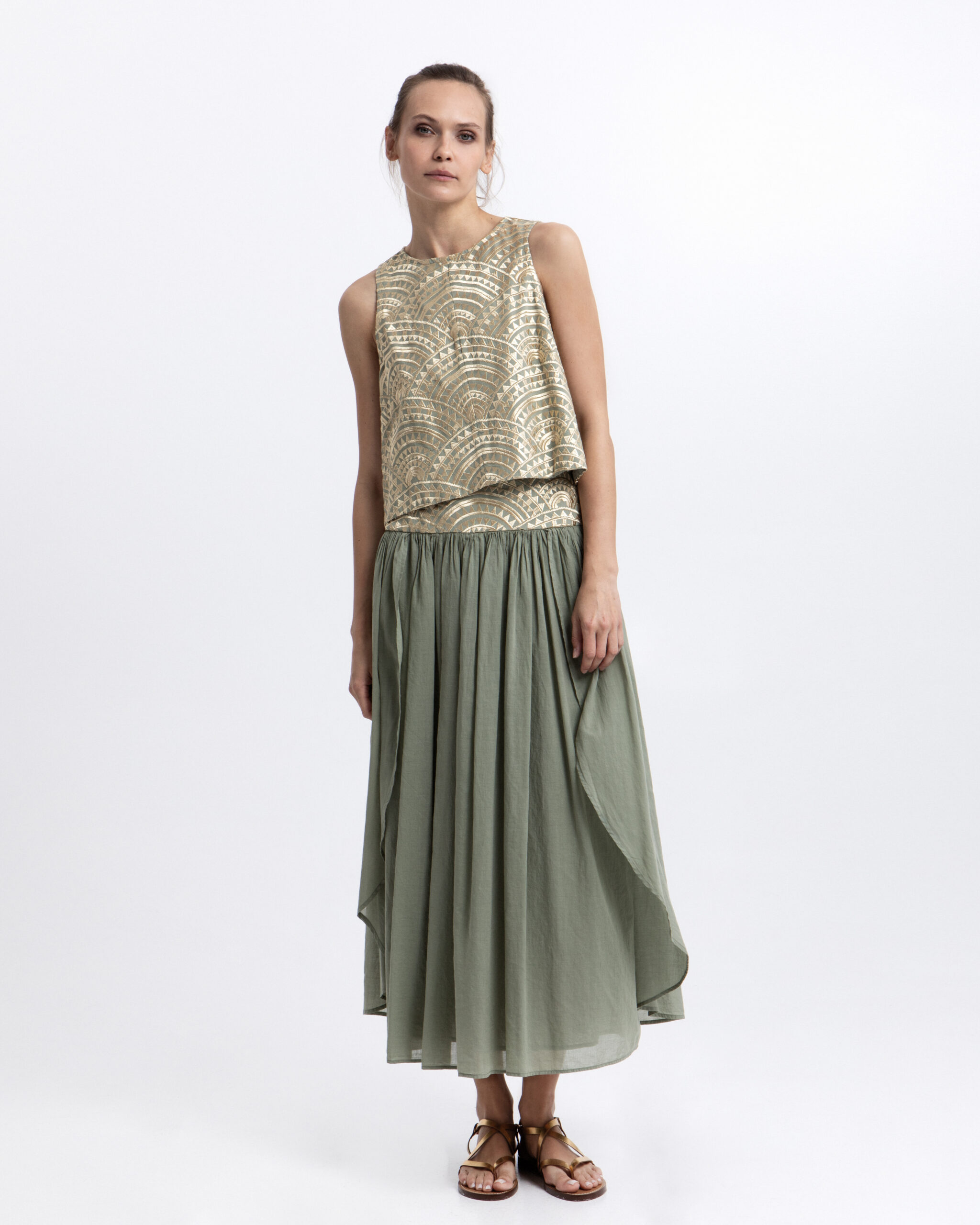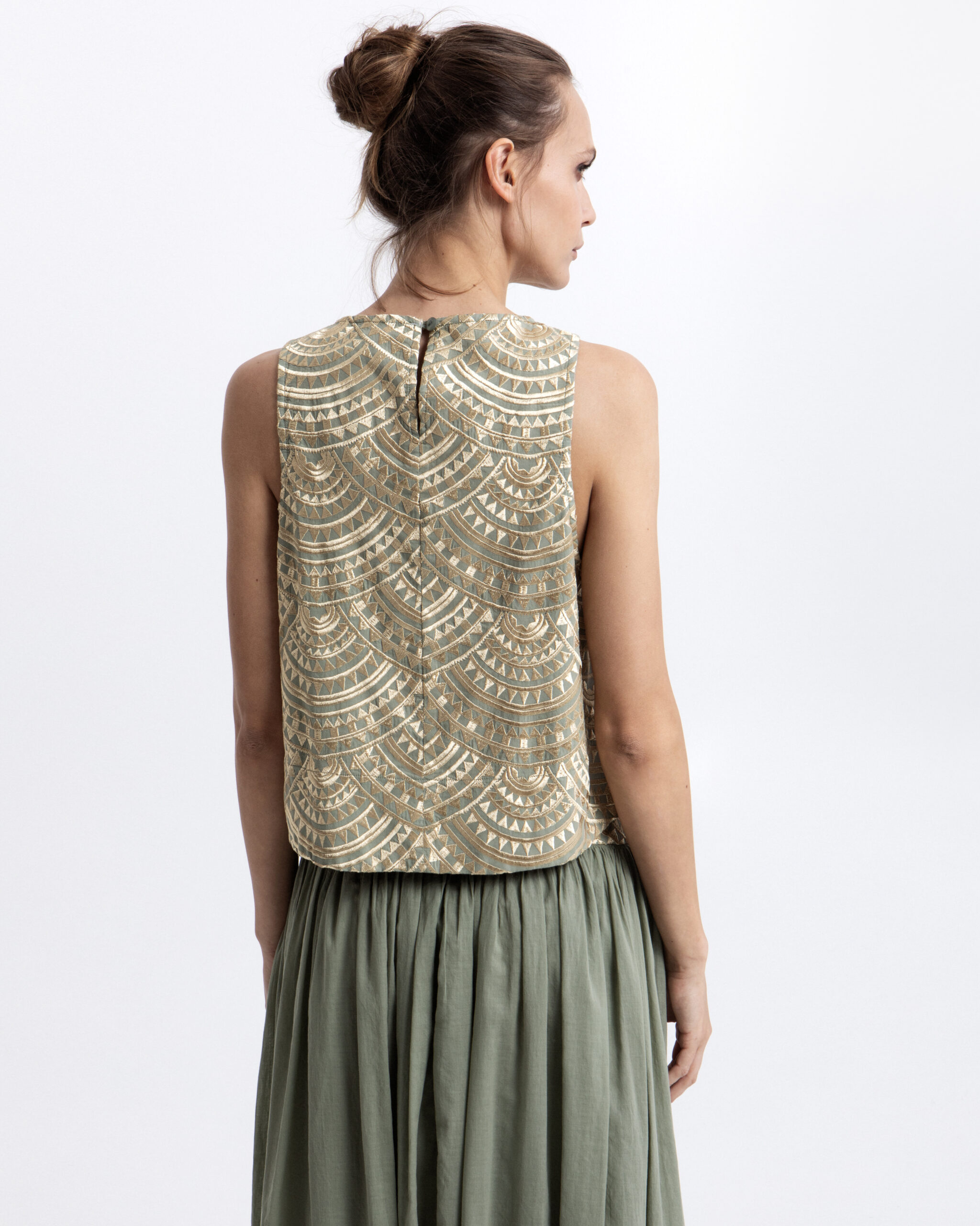 A sleeveless sage-hued top adorned with intricate gold embroidery throughout, blending artisanal detail with refined elegance. Its unique design adds a statement touch while maintaining a graceful, sophisticated feel.