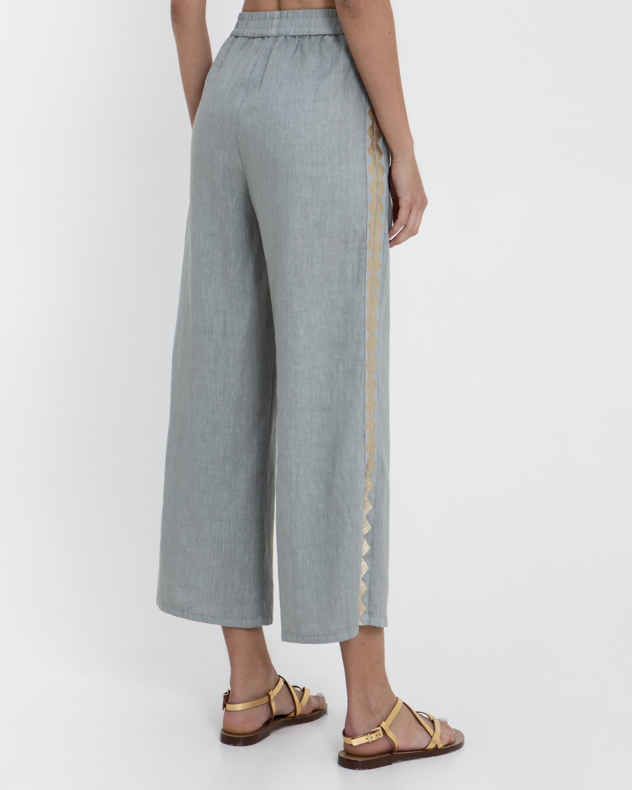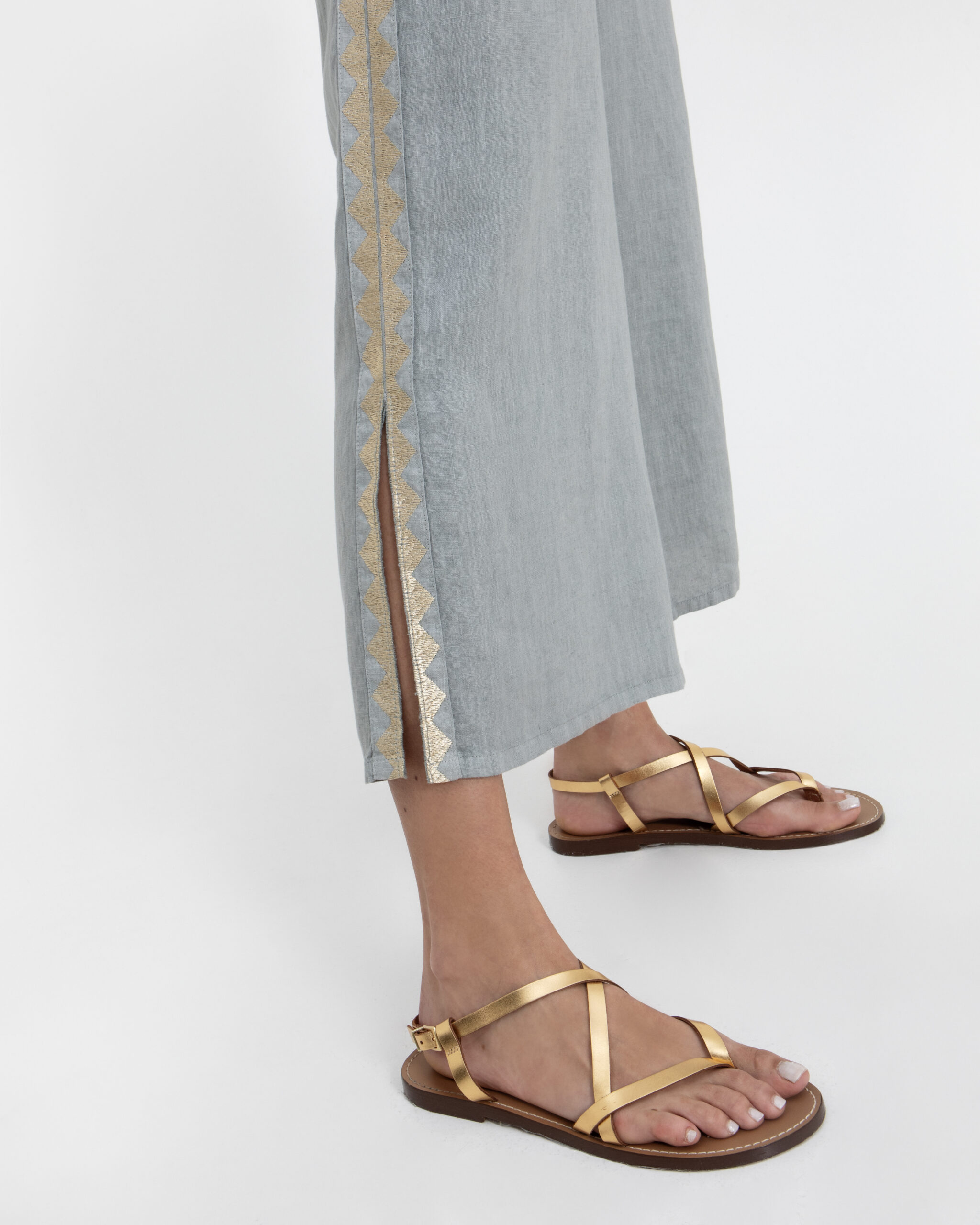 Effortlessly stylish light grey stone linen pants with elegant side slits and a gold feather-inspired trim. Finished with an elasticated waist, they combine comfort with a breezy Mediterranean feel.