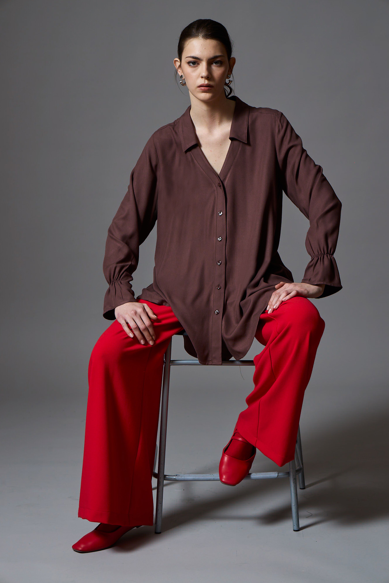 Sophisticated and elegant, this shirt features a classic collar with a V-neckline that flows into a button-down closure. The high-low hem and loose, comfortable fit create graceful movement, while gathered elastic cuffs add a subtle touch of refinement. A timeless piece that balances ease with elegance.