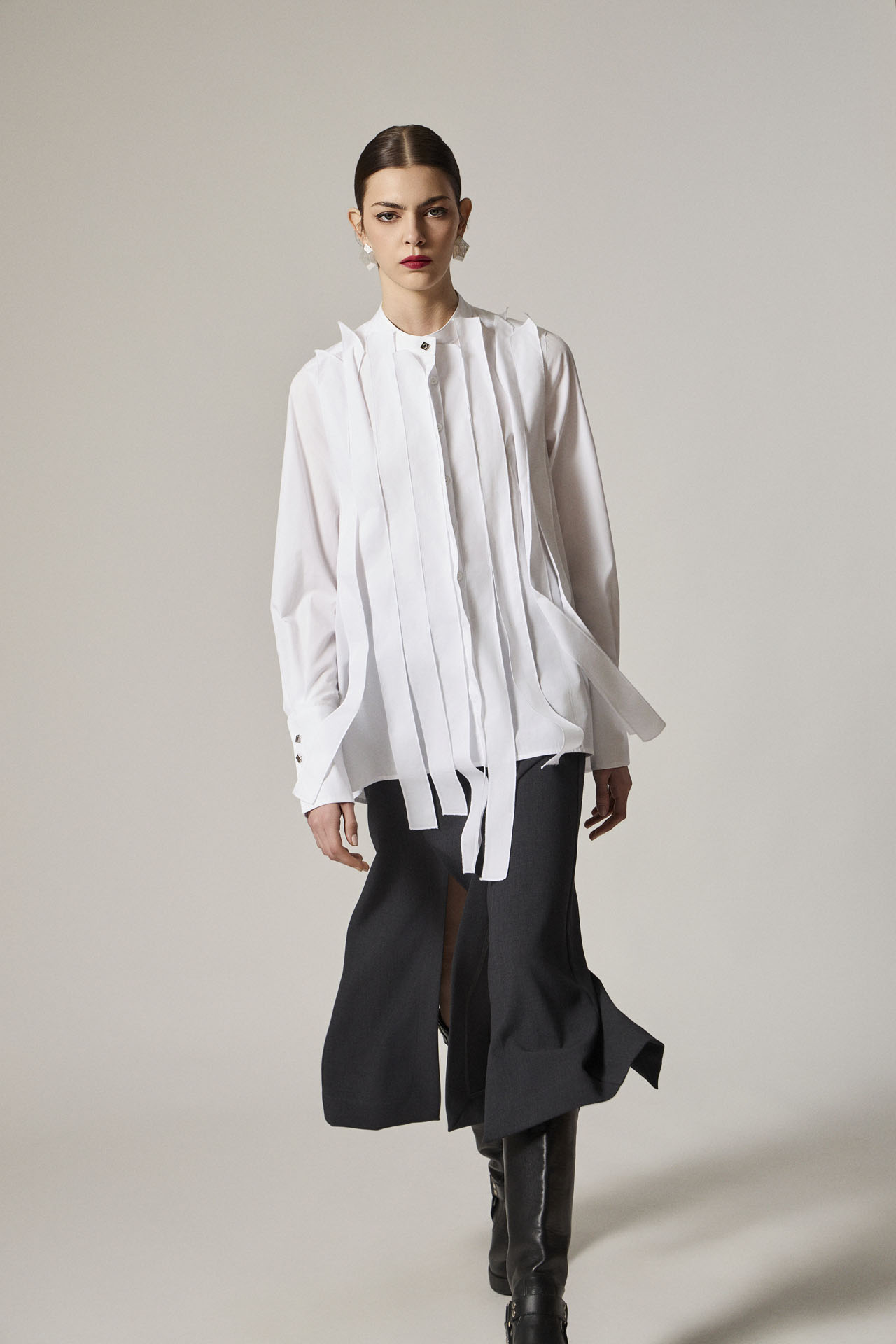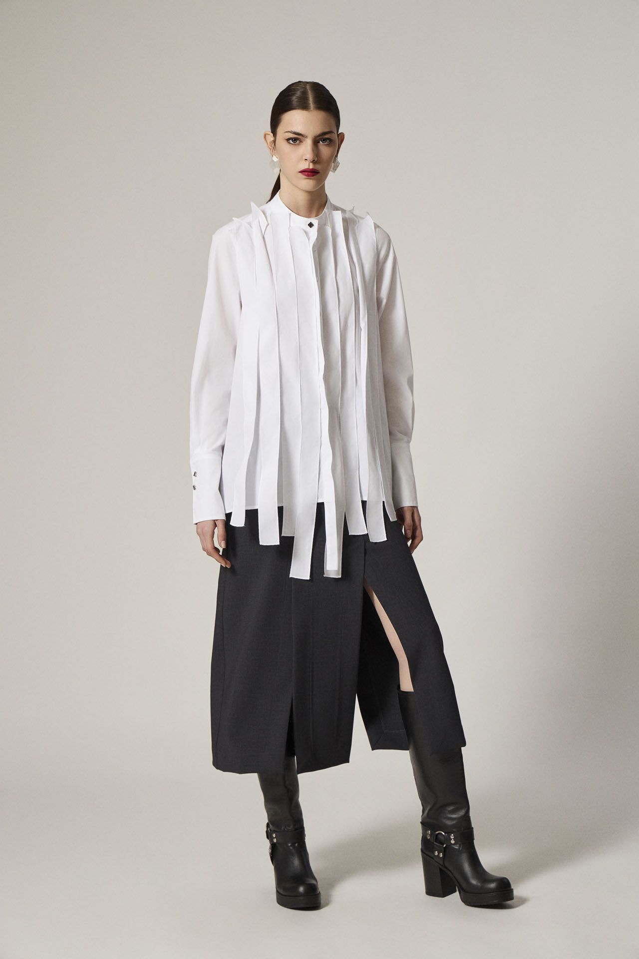 Elevate your office wardrobe with this charcoal high-rise skirt. Crafted in a soft, luxurious fabric, its straight cut features daring slits on all sides—creating a modern, original silhouette. Sleek, versatile, and effortlessly sophisticated, it’s a statement piece for the contemporary wardrobe.