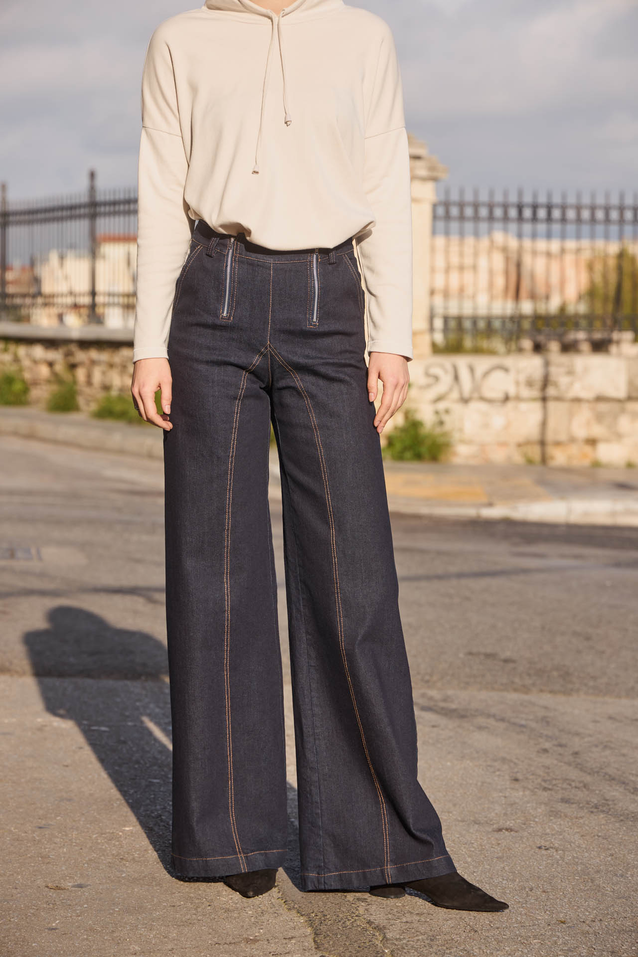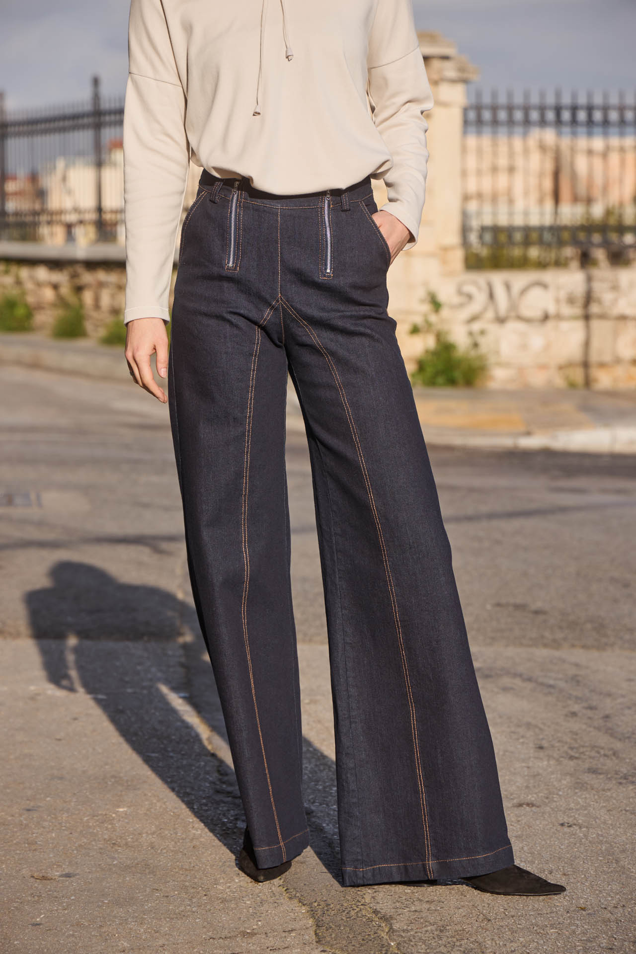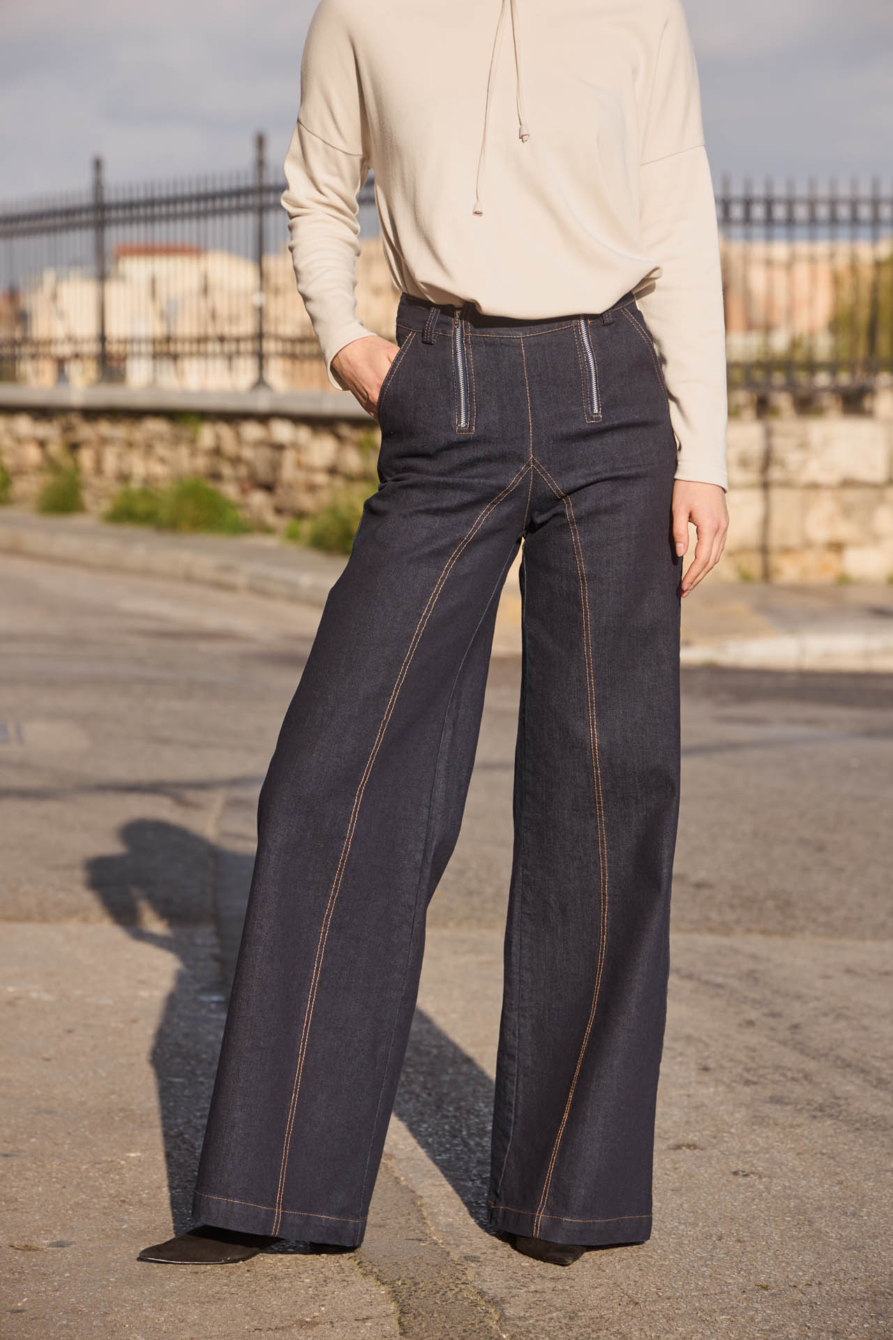 Effortlessly chic, these dark blue wash denim trousers feature a flattering high-rise fit and wide-leg silhouette that elongates the legs. Designed with back pockets and two off-centered zippers for an original, fashion-forward detail, plus a touch of stretch for all-day comfort. A versatile piece that combines style, ease, and unique flair for both casual and elevated looks.