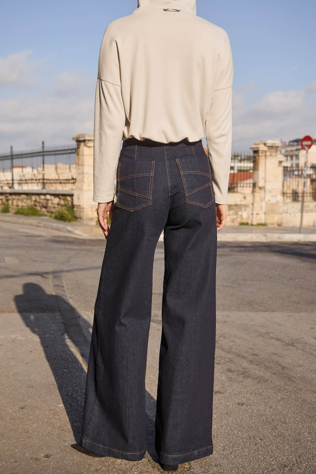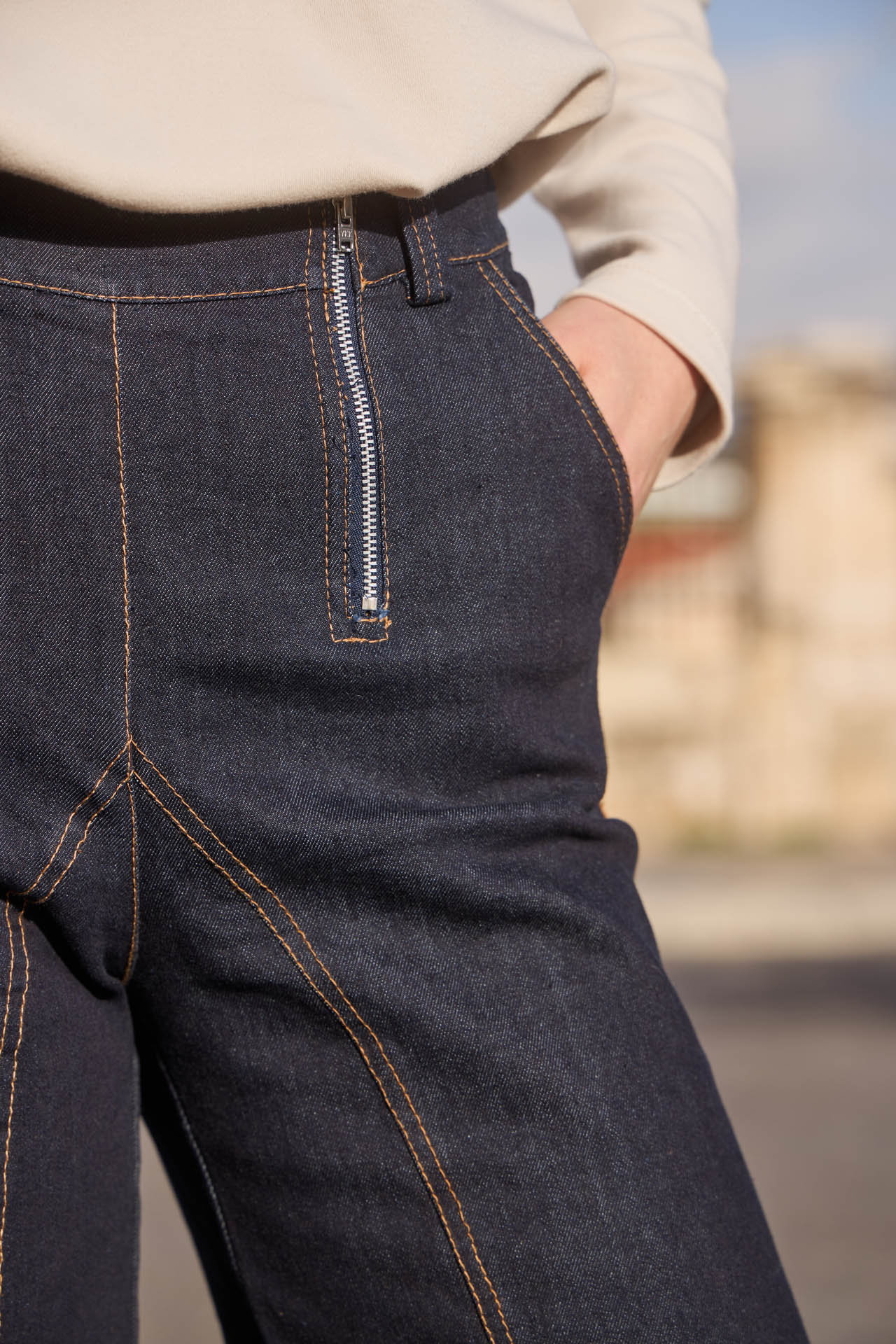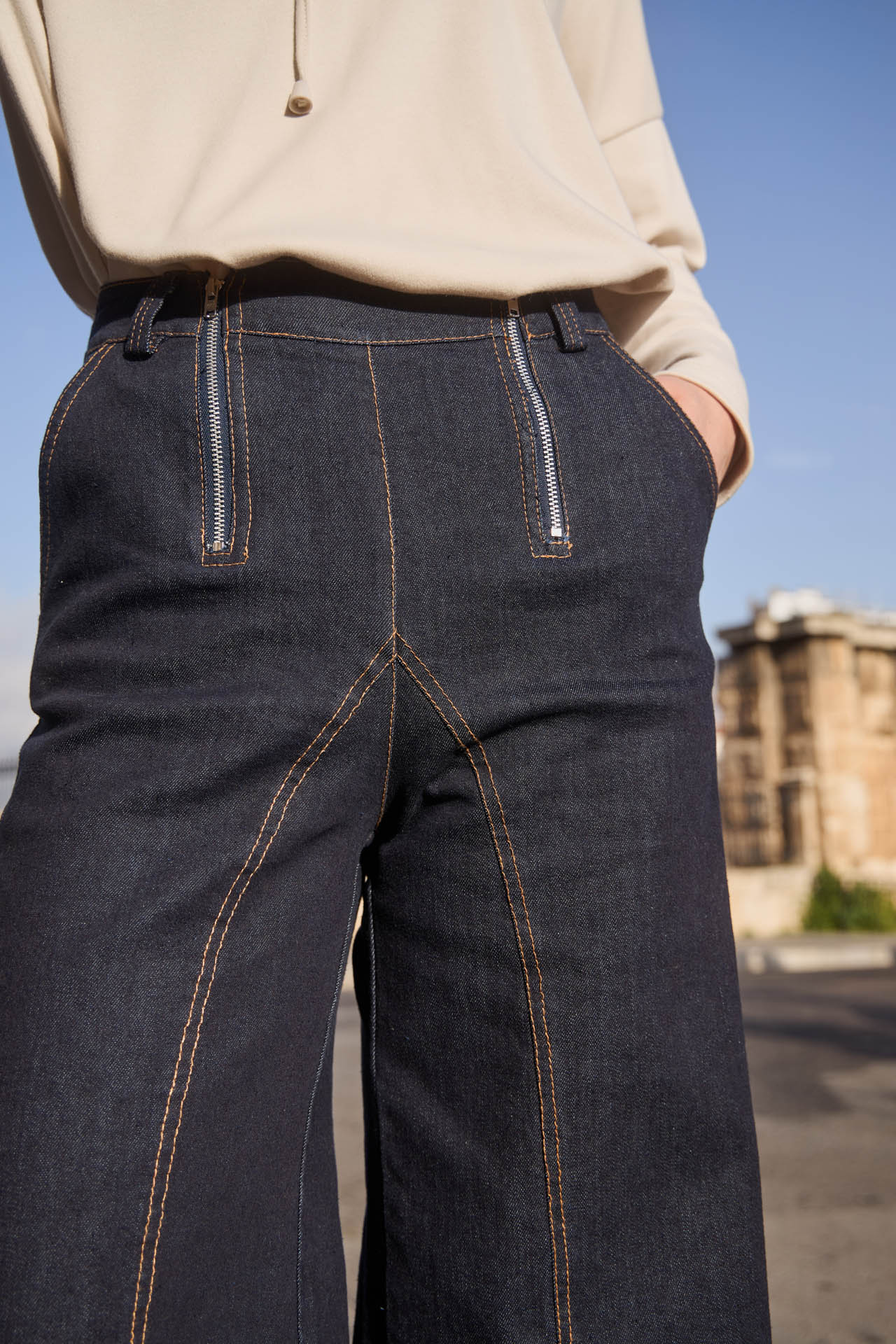 Effortlessly chic, these dark blue wash denim trousers feature a flattering high-rise fit and wide-leg silhouette that elongates the legs. Designed with back pockets and two off-centered zippers for an original, fashion-forward detail, plus a touch of stretch for all-day comfort. A versatile piece that combines style, ease, and unique flair for both casual and elevated looks.