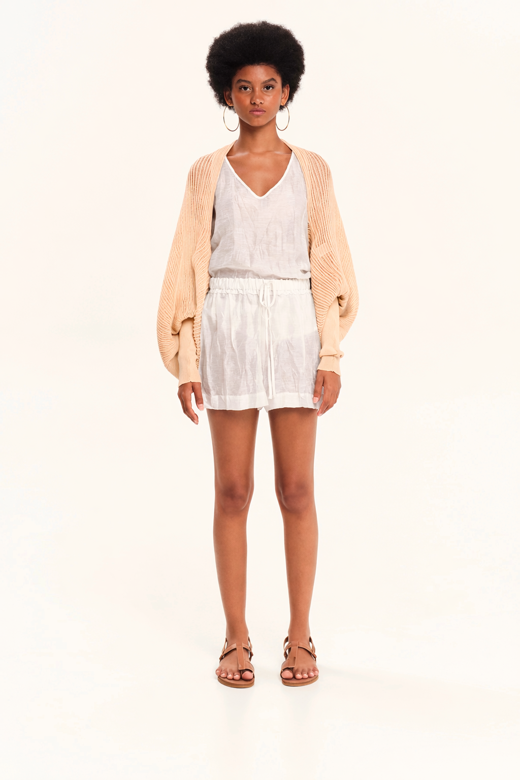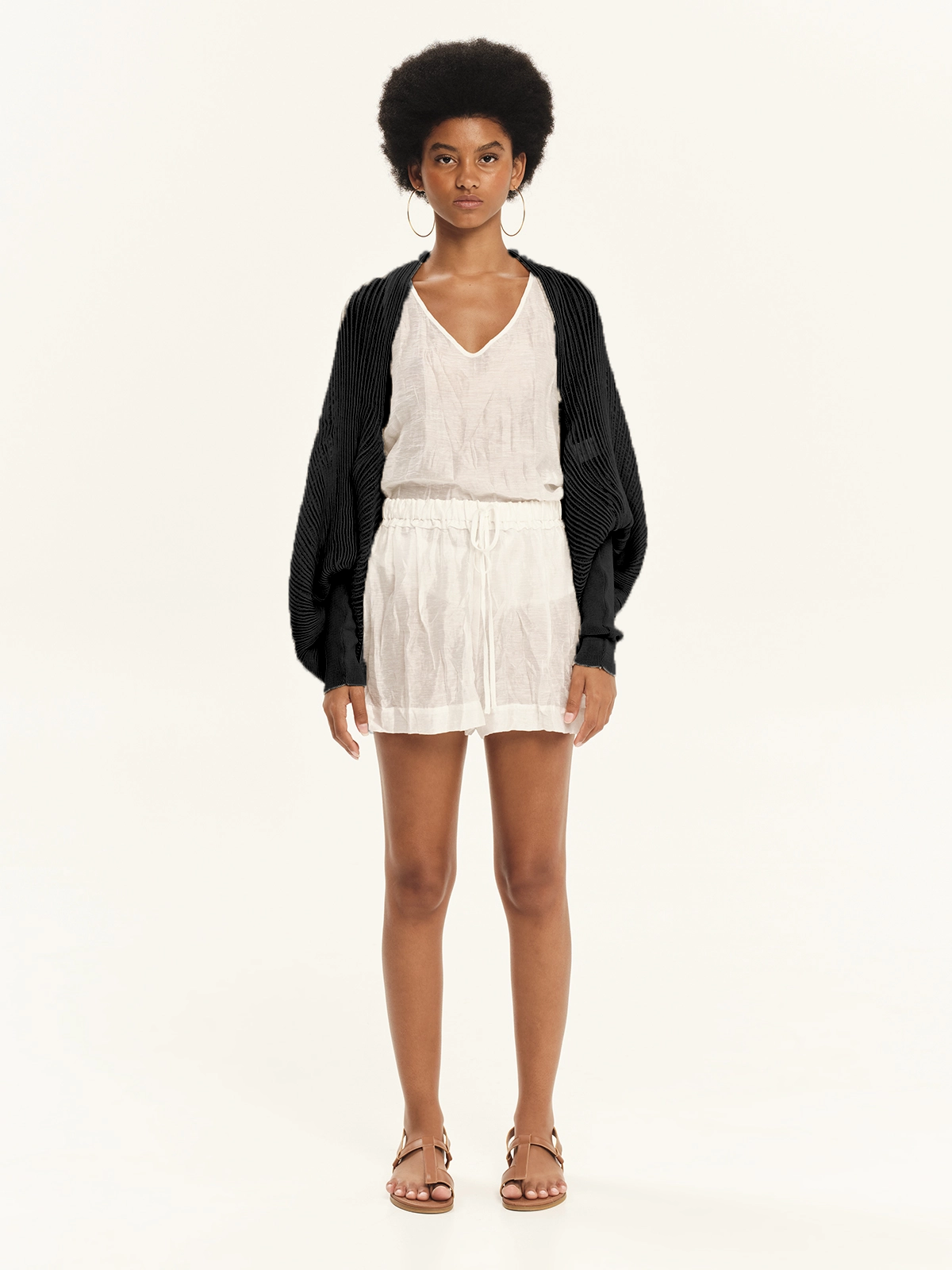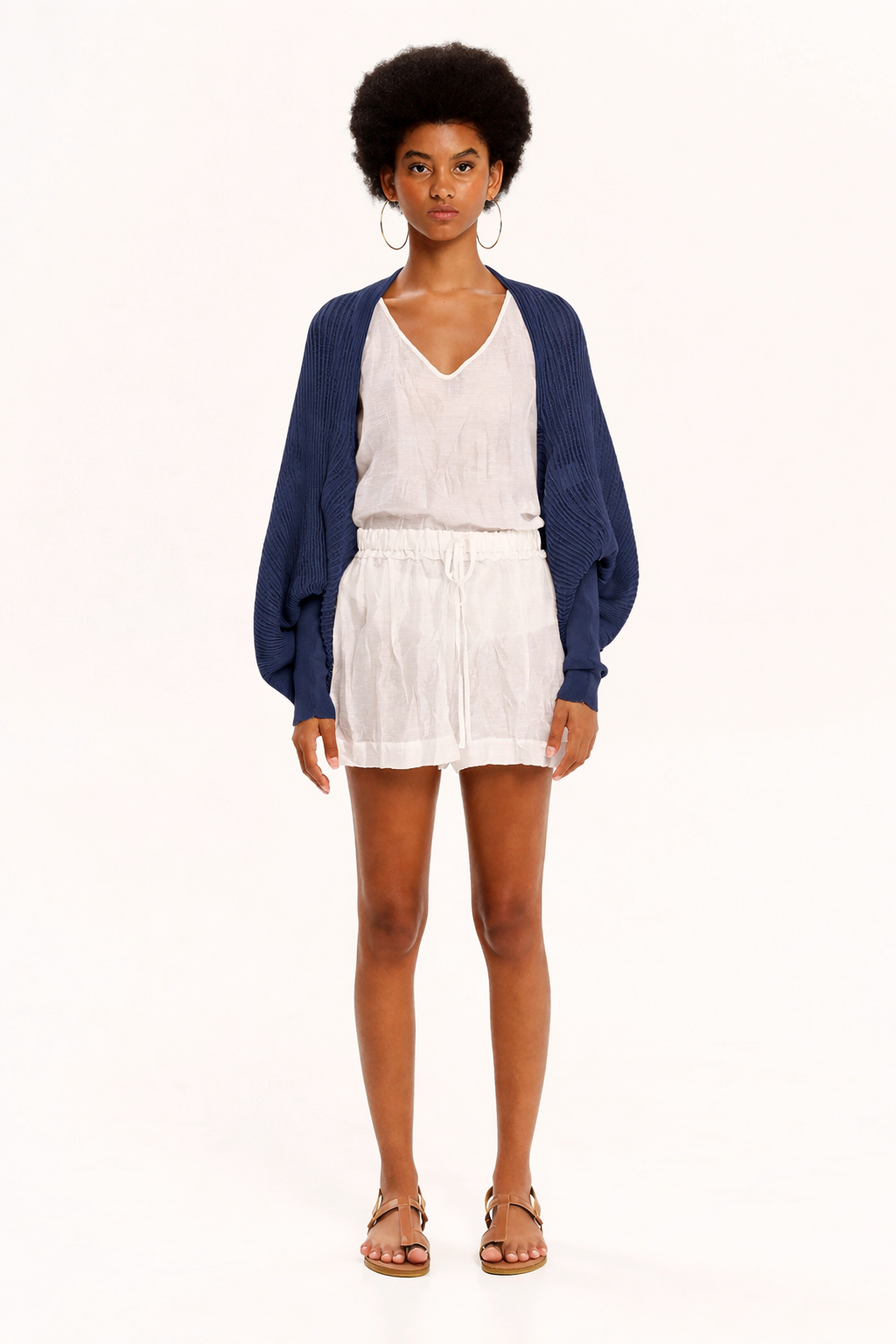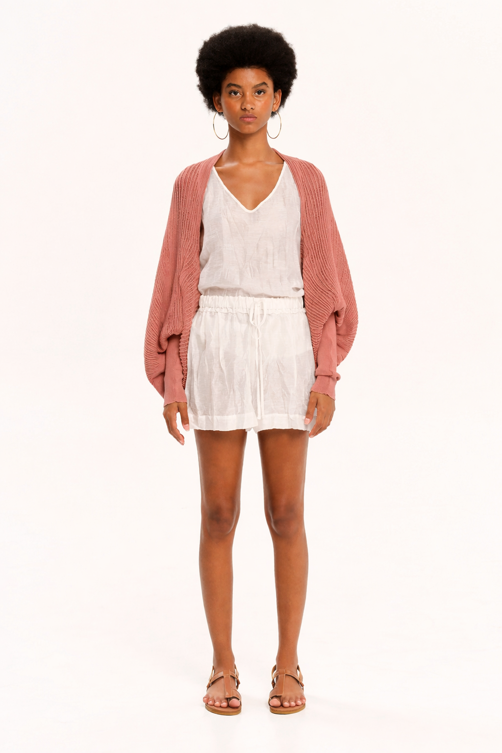 A light knit bolero that blends comfort with understated elegance. Designed with a relaxed, loose fit, it drapes effortlessly over the shoulders while maintaining a polished silhouette. The soft knit texture adds a touch of refinement, making it a versatile layering piece—perfect for elevating both casual outfits and more sophisticated looks.