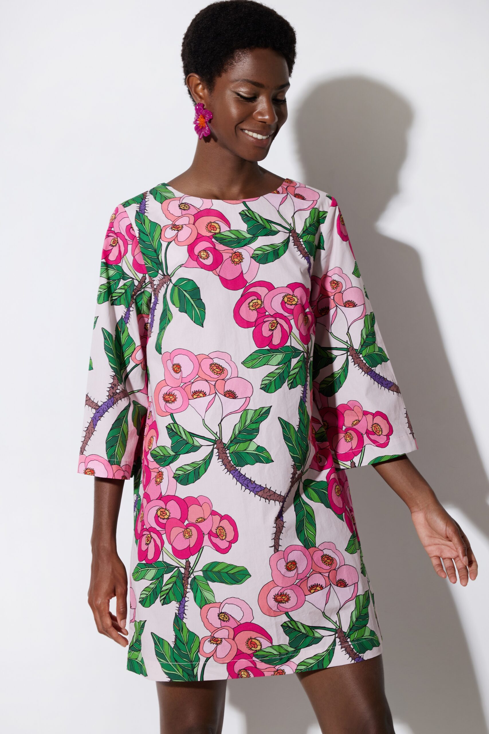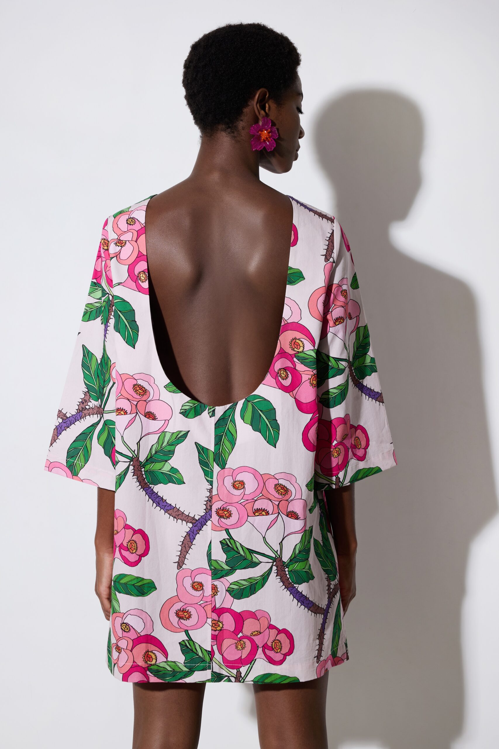 Crafted from 100% cotton, this floral dress combines natural comfort with effortless charm. Featuring a soft round neckline and an alluring open low back, it’s designed with a loose, straight fit that drapes gracefully on the body. Three-quarter length sleeves add a touch of refinement, making it a breezy yet elegant choice for sun-drenched days or relaxed summer evenings.