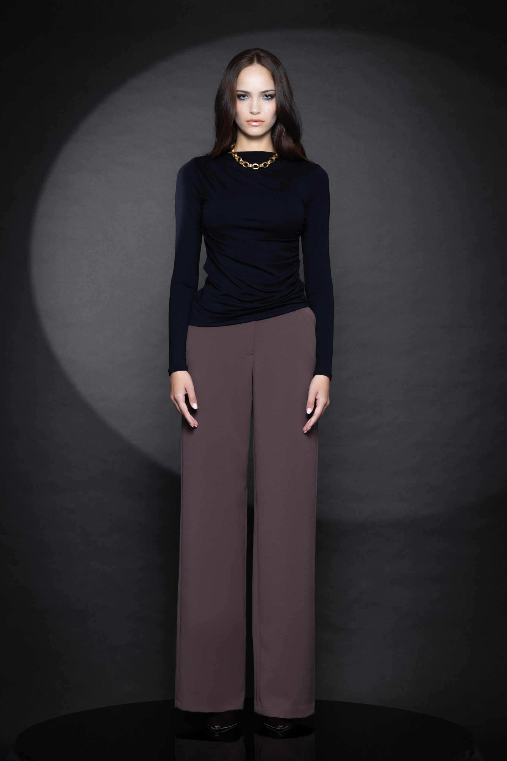 Crafted from soft bamboo fabric, this elegant black top features a refined boat neckline, gathered side detailing, and slim fit sleeves. With its natural drape and form-flattering fit, it blends timeless sophistication with everyday ease.