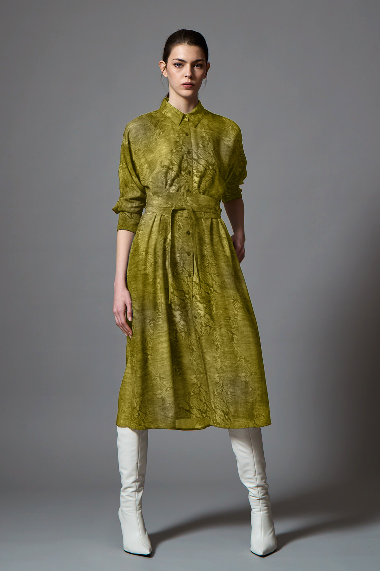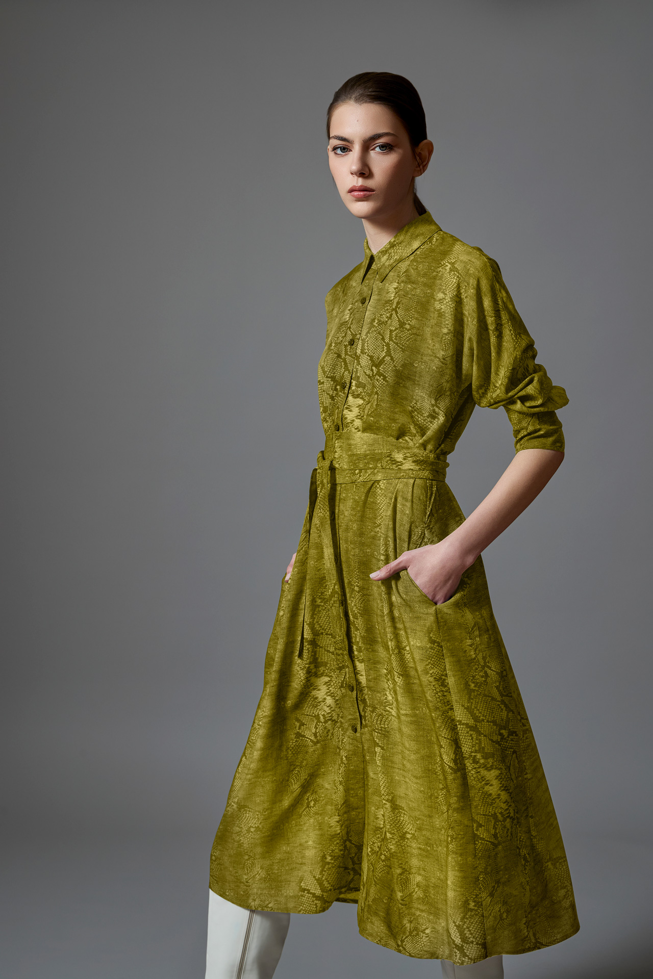 Designed for effortless elegance, this midi-length shirt dress in green-lime features a subtle snakeskin print softened with brown hues for a refined, modern edge. The button-front style is finished with a removable self-belt to define the waist, while discreet side pockets add functionality. Flowing with ease in a relaxed silhouette, it offers versatile styling that transitions seamlessly from casual chic to elevated occasions.