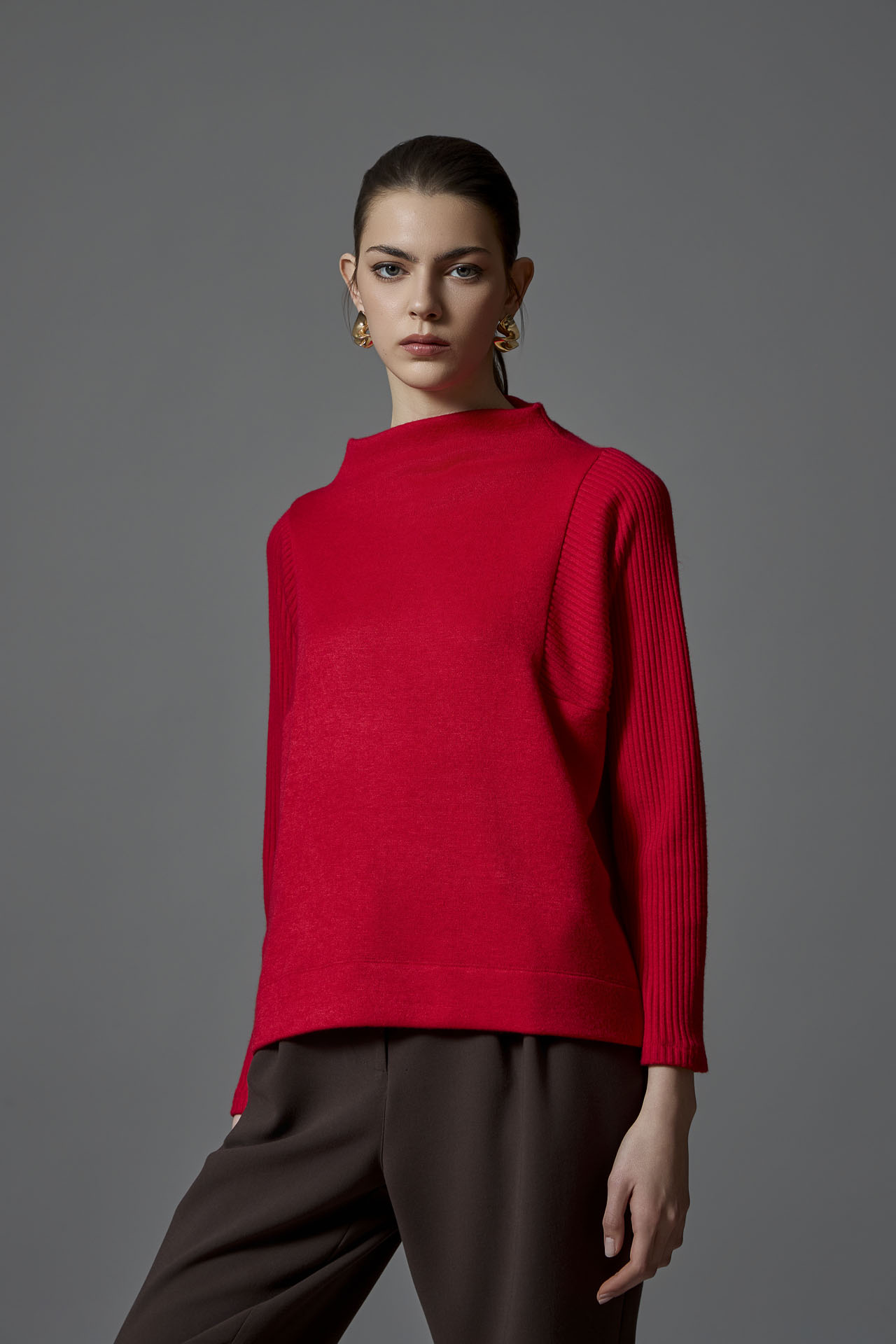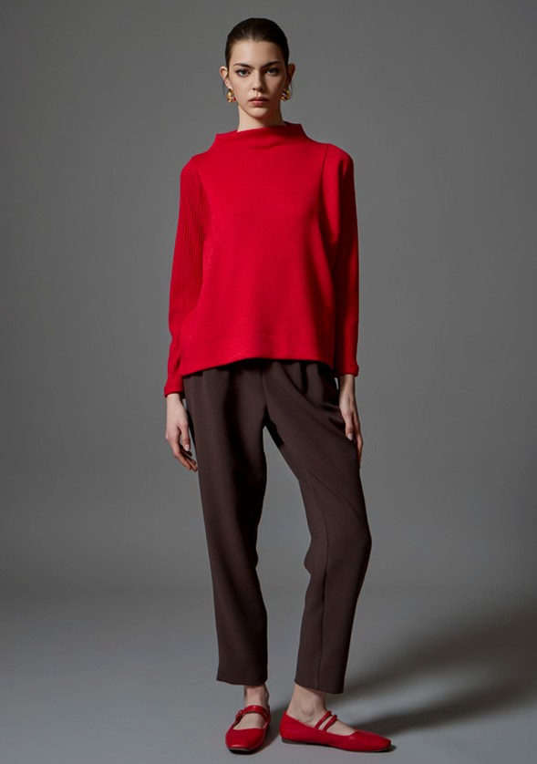 A timeless fall essential, this red soft-knit sweater is crafted with subtle ribbing at the sleeves and finished with a sophisticated funnel collar. Elegant yet effortless, it offers warmth, comfort, and style in one—perfect for elevating any autumn wardrobe.