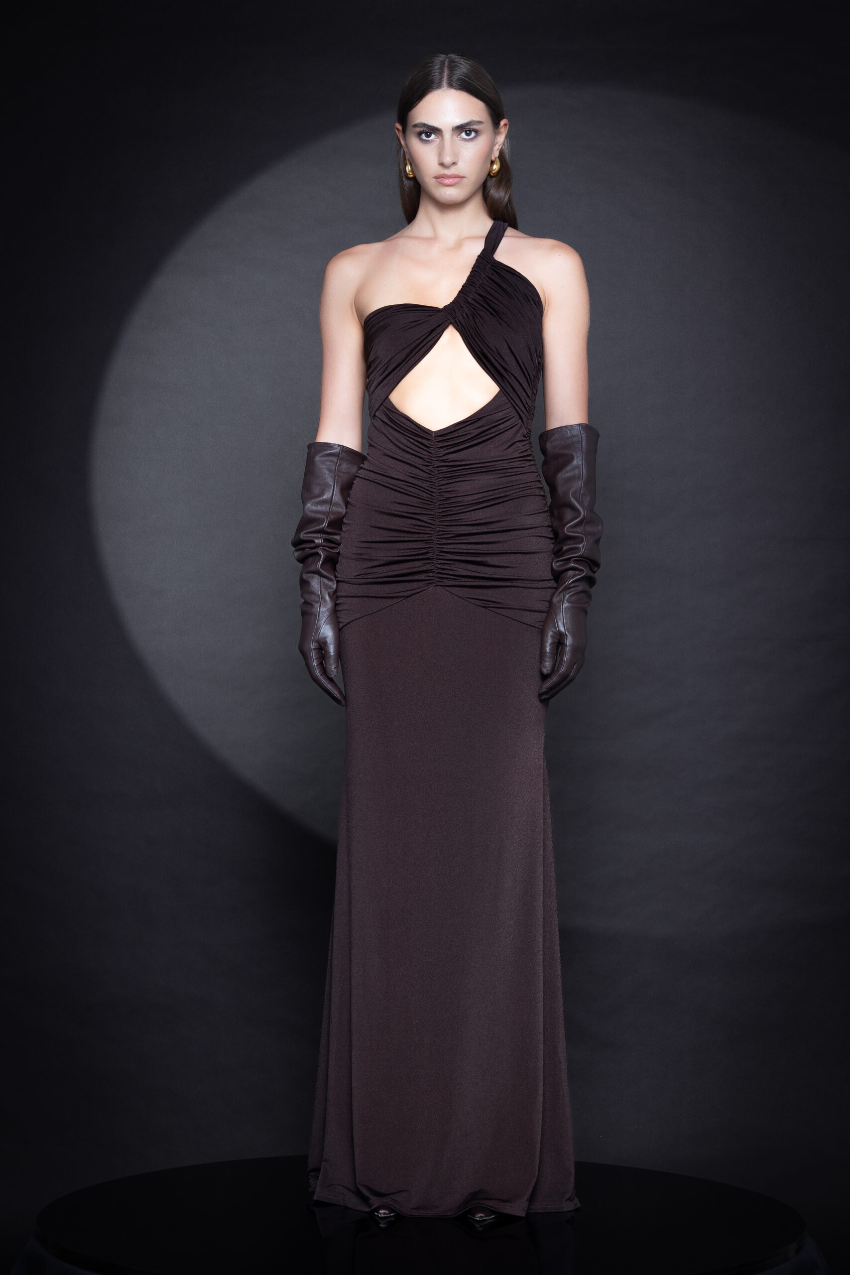 Elegant and seductive, this one-shoulder gown in rich chocolate brown features intricate ruching that flatters the silhouette and a daring front cutout for a modern edge. Crafted from soft, fluid fabric that drapes beautifully, it exudes sophistication and confidence. Finished with a floor-length hem for a dramatic evening statement.