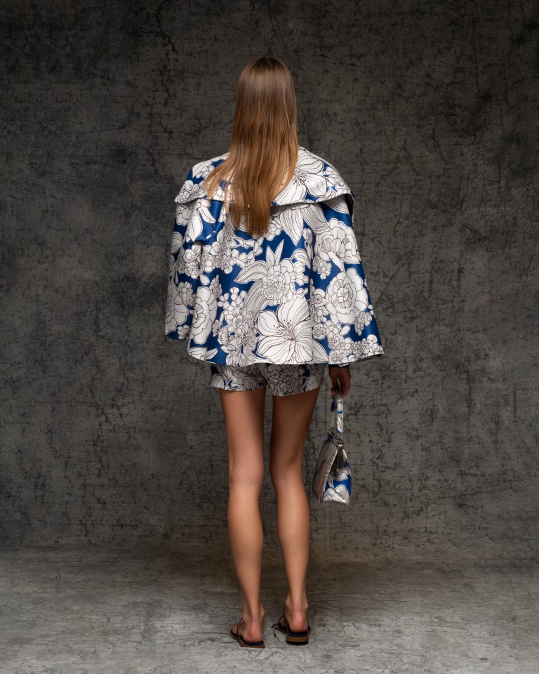 Make a statement in this exquisite open-front jacket, crafted from a sumptuous satin-like fabric in a serene blue hue adorned with delicate floral print. Its oversized, sculpted collar and relaxed silhouette create a modern, fashion-forward appeal, while the two front patch pockets add subtle functionality. Fully versatile, this piece elevates any ensemble with effortless sophistication and contemporary elegance.