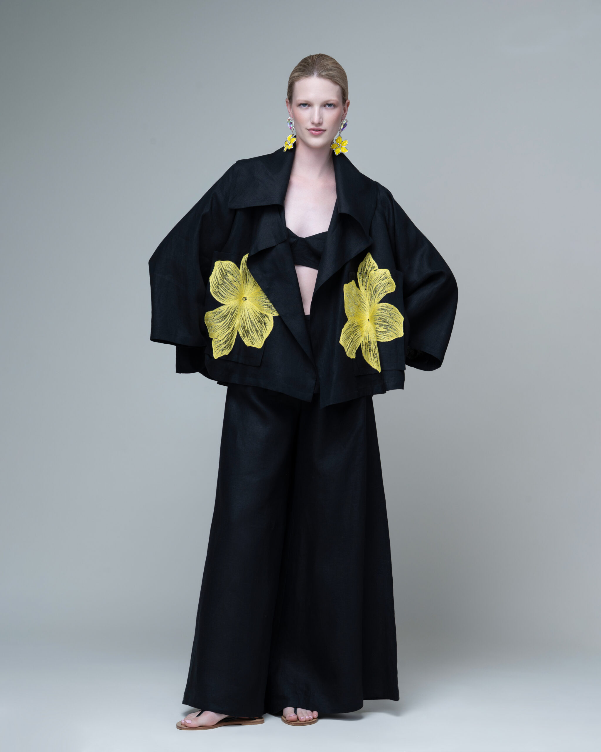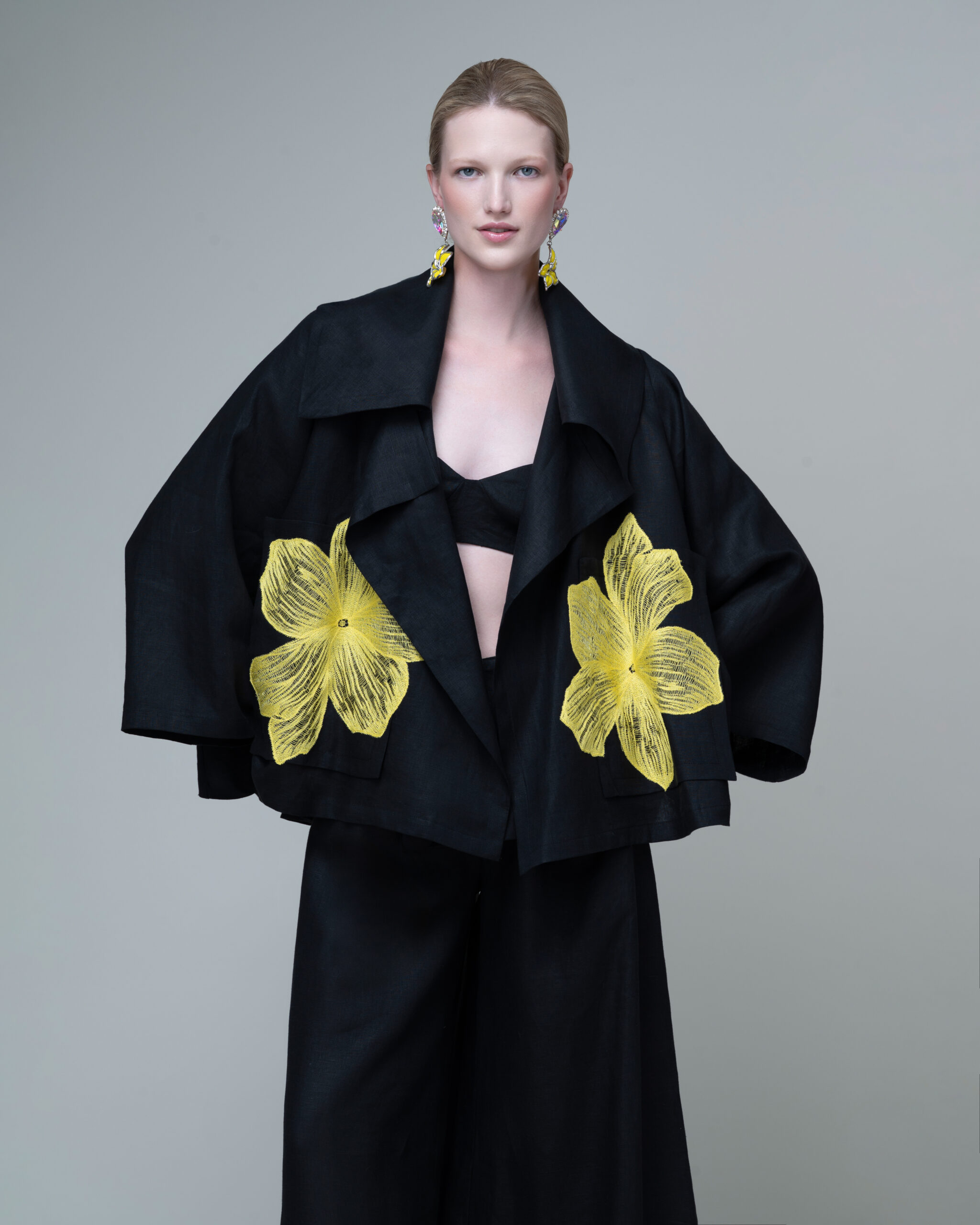 Make a statement in this striking open-front jacket, crafted from black linen for a refined yet effortless feel. Bold, oversized yellow appliqué at the front adds an artful focal point, creating a stunning contrast against the deep black base. Its sculpted collar and relaxed silhouette lend a modern, fashion-forward edge, while two front patch pockets offer subtle practicality. Versatile and elevated, this piece brings contemporary sophistication to any look, from daytime chic to evening polish.